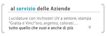 Tampografia Serigrafia Il MagoDal 1980 IL MAGO è un'azienda leader nella produzione autoadesivi - vetrofanie striscioni, targhe, pannelli, adesivi e serigrafie speciali, un'esperienza trentennale proiettata sui mercati del nuovo millennio per offrire qualità, ricerca, alta tecnologia e standardizzazione del prodotto. Inoltre IL MAGO è sinonimo di garanzia, di assistenza, gestita da personale altamente qualificato, in grado di seguire i clienti a partire dalla fase progettuale fino al momento della produzione, mediante sistemi computerizzati. |
